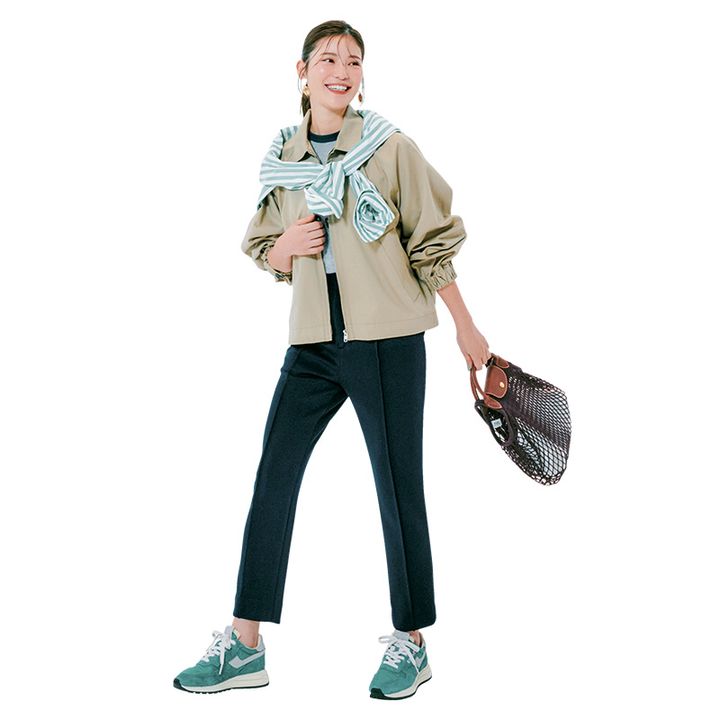パンツは家で洗えるから、アウトドアシーンでも臆することなく使えるのが嬉しい! パンツ¥17,600(スリースクエア)ブルゾン¥38,500 Tシャツ¥10,450(ともにシップス ナインケース/シップス インフォメーションセンター)シャツ¥49,500〈アスペジ〉スニーカー¥36,300〈オートリー〉(ともにトヨダトレーディング プレスルーム)バッグ¥19,800(ロンシャン/ロンシャン・ジャパン)イヤリング¥13,200(マージョリー・ベア/ココシュニック 新宿タカシマヤ店)