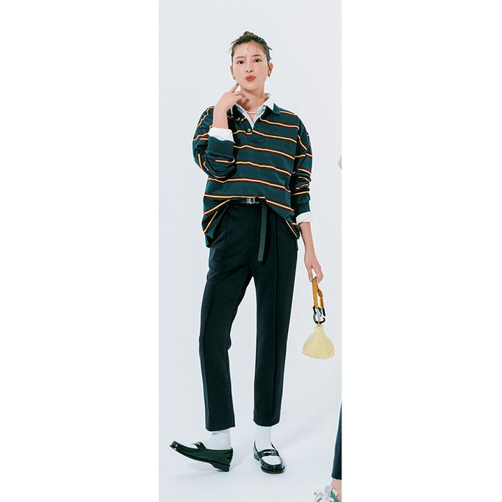ともするとメンズっぽすぎるラガーシャツも、ネイビーの上品さでキレイめに着地。パンツ¥17,600(スリースクエア)ラガーシャツ¥29,700(アンスクリア/アマン)シャツ¥19,800(アルページュストーリー)ベルト¥11,000(レフィエ/フラッパーズ)バッグ¥25,300(ノマディス)シューズ¥34,100(ジーエイチバス/ジーエイチバス 東京)ソックス¥770(靴下屋/タビオ)ピアス¥77,000(ココシュニック)ネックレス¥18,920(メルセデス・サラザール/ZUTTOHOLIC)