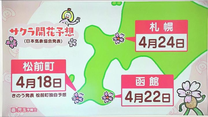今年は今日明日開花ということはないですが、平年より早い予想です。日本気象協会の最新の予想によると札幌はおよそ10日後の4月24日、函館は1週間後の4月22日、そしてきのう14日(月)に松前町が独自で発表した予想では、4月18日ということで、今週中に桜前線が北海道にやってくるかもしれません。ちなみに、きょう15日(火)は秋田県で開花の発表がありました。