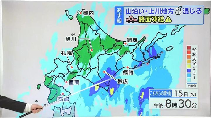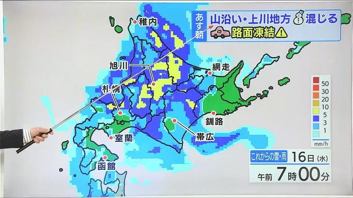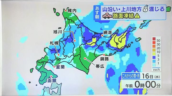 あす16日(水)の朝にかけても雨が降り、道北や道央でも降り方が強まります。また、上空に冷たい空気が入るため、あす朝は山沿いや上川地方では雪がまじるでしょう。路面凍結にも注意して下さい。