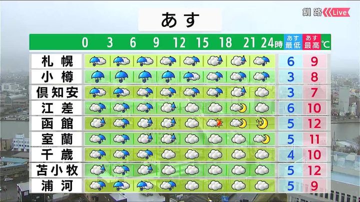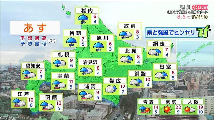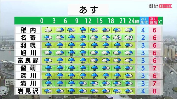 各地で雨が強まり、傘を持つ手が冷たいでしょう。土砂災害や川の増水にも注意して下さい。名寄など内陸では朝晩は雪がまじります。