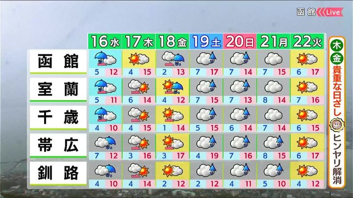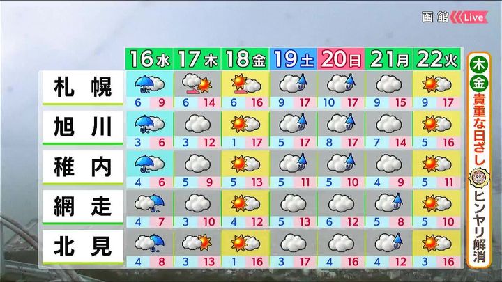 木曜は札幌で日差しが戻り、ヒンヤリした空気も解消します。金曜日は各地で晴れて暖かくなるでしょう。