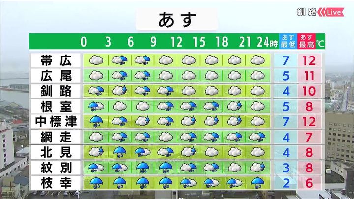 各地で雨が降るでしょう。最低気温はけさと同じですが、最高気温はきょう15日(火)より低く、北見はきょうより8度も低い8度です。