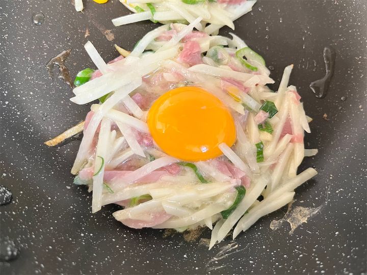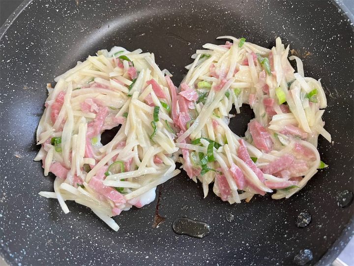 千切りにしたじゃがいもの生地をフライパンの上でドーナツ状にし、真ん中に卵黄を落として焼いていきます。
