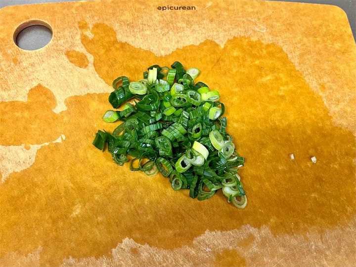 わけぎは小口切りにし、ハムは細切りにします。