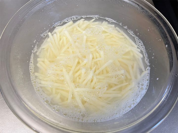 1. じゃがいもの皮をむき、ピーラーやスライサーで千切りにして、水にさらしておきます。