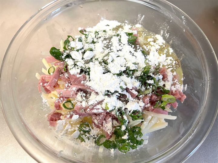 3. 2に小麦粉、塩、こしょうを加え、混ぜ合わせます。