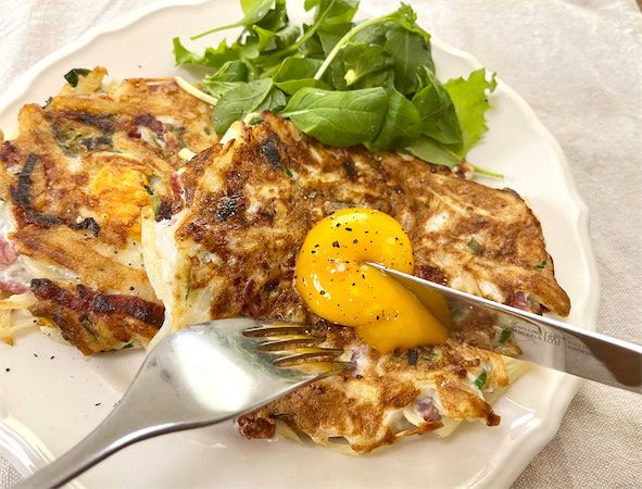 【驚愕の1140万回再生】海外発!千切りポテトと卵で「黄金焼き」焼こう!生地はふんわり黄身とろ~り♡