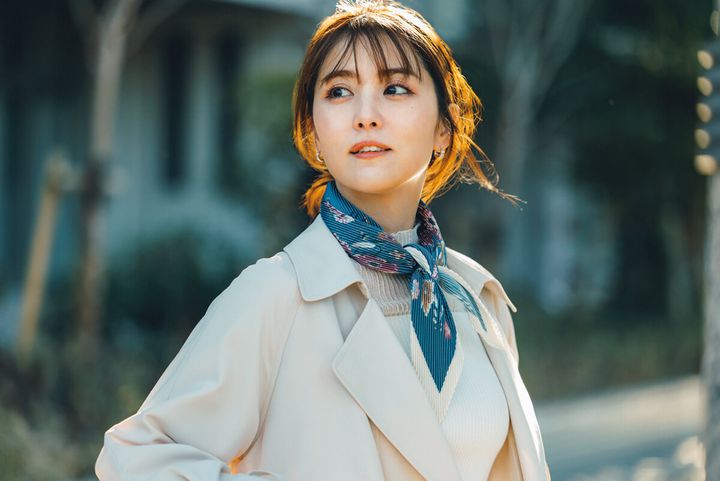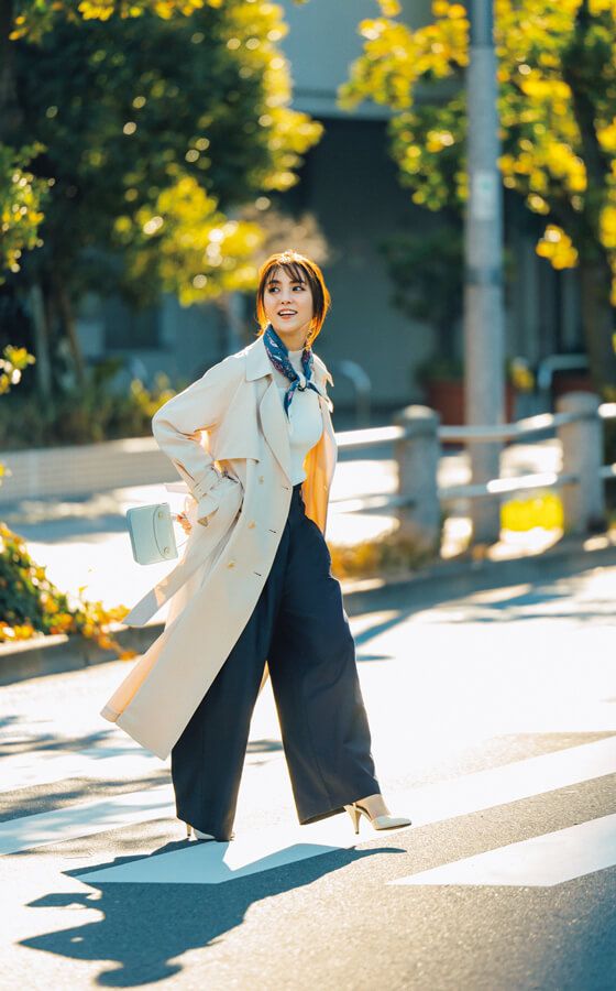 トレンチ×スカーフの相乗効果で通勤パンツルックに女優オーラを