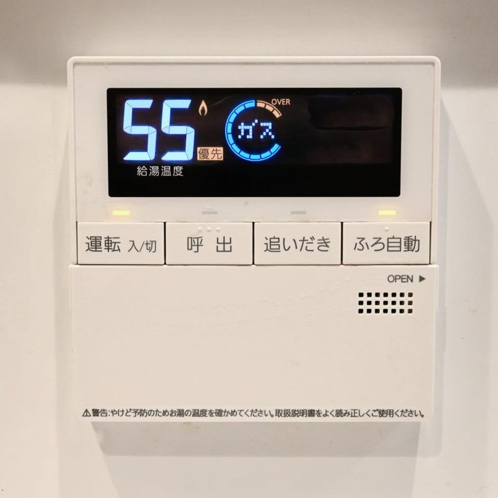 流し台の横にある給湯リモコンで温度を設定。お子さんがいるご家庭は万が一のやけどに備えて、温度を上げすぎない方がいいかもしれません。ご注意を!