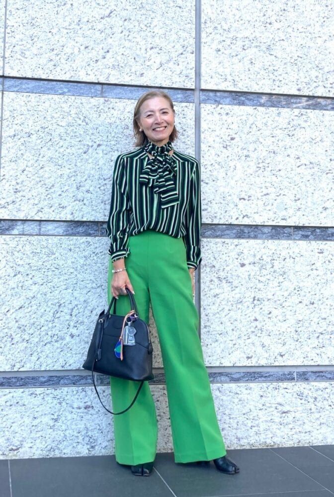 「しばらく天気が悪かったので、明るい雰囲気にしたいと思ったのと、春らしいカラーを楽しみたくてグリーンを選びました」と信田さん。インポートのシャツに、鮮やかなグリーンの「メゾンスペシャル」のパンツを合わせた着こなしは、登場するだけでその場が華やかに!ワイドなシルエットのパンツは、センタープレスがありウエスト位置が高いのでさらに脚長効果も。品よく軽やかな装いは、これからの季節にぴったりです。