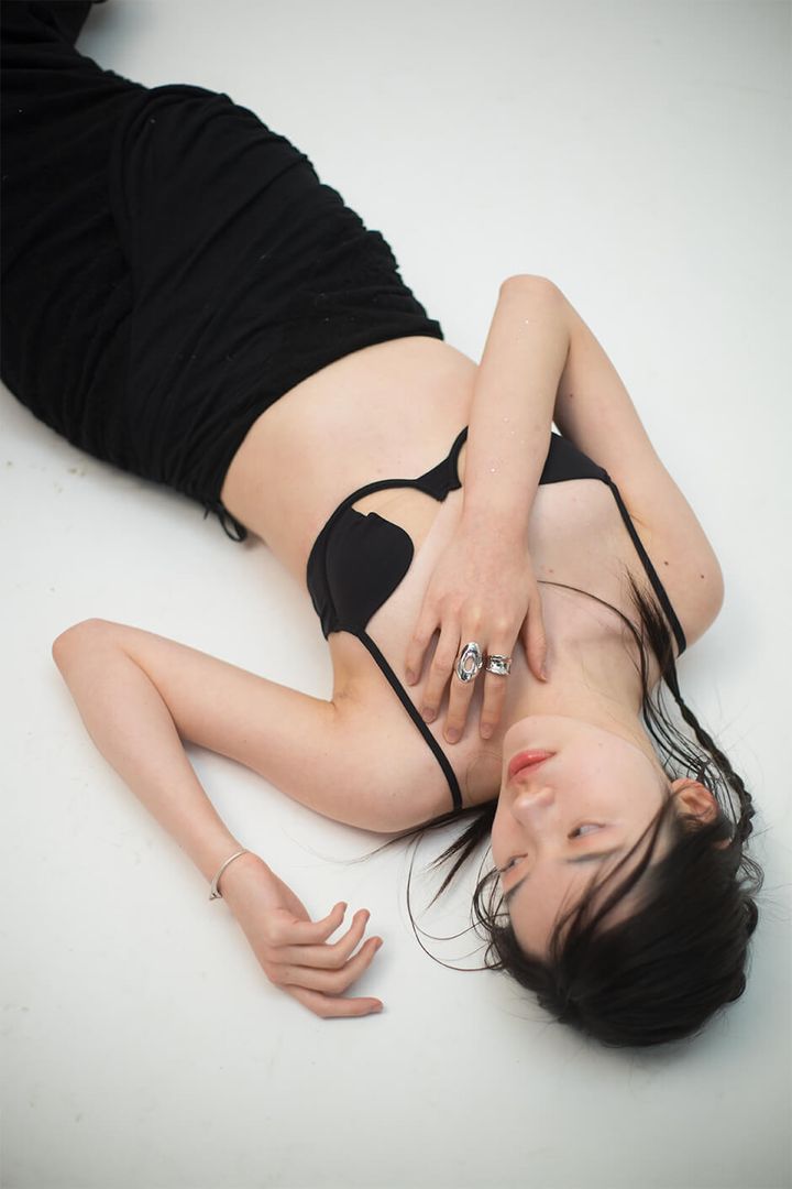 bra by HER SENSES, skirt by ELYWOOD, open-hole ring by AESAVANT, silver ring by MONSECRET, bracelet stylist’s own