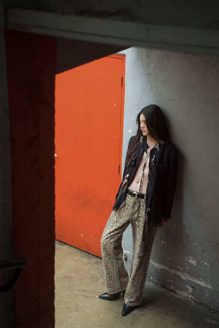 jacket, trousers and belt by TRINITE STUDIO, necklace by MONSECRET, gold ring by HERHERLIN, open-hole ring by AESAVANT, silver ring by MONSECRET, shoes and belt stylist’s own