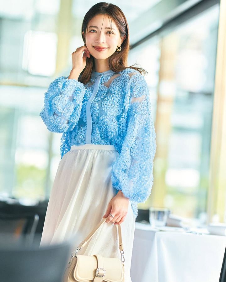ランチやお呼ばれ、いつもより少しオシャレしたい日はワンツーコーデでもしっかり華やげるデザイントップスに頼って。ブーケのように施されたモチーフが愛らしさ満点のブラウスは羽織りとしても着られる優れもの。これからの季節出番が増えそう。