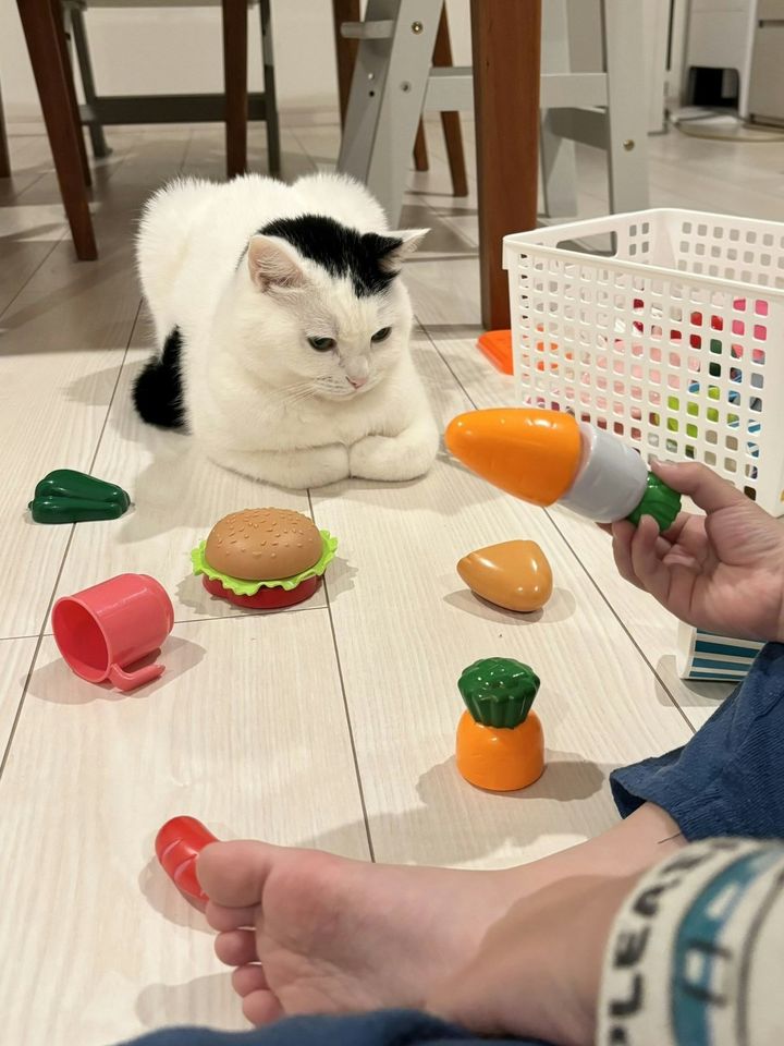 【癒やし】おままごとを「ふむふむ…」と見つめる猫ちゃんに2.2万の優しい眼差し