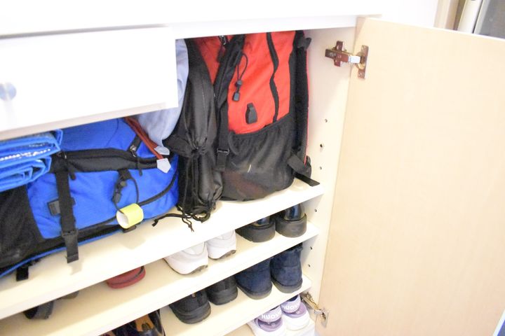 わが家では、廊下にある収納の一部を防災グッズ保管庫にしていますが、そこだけでは非常食や保存水、非常用トイレ、カセットボンベなどすべての備蓄を収めることができません。そのため、保存水は保管庫のほか、3か所あるクローゼットの隙間の計4か所に分けて収納し、家族3人分の63Lがしっかり収まっています。