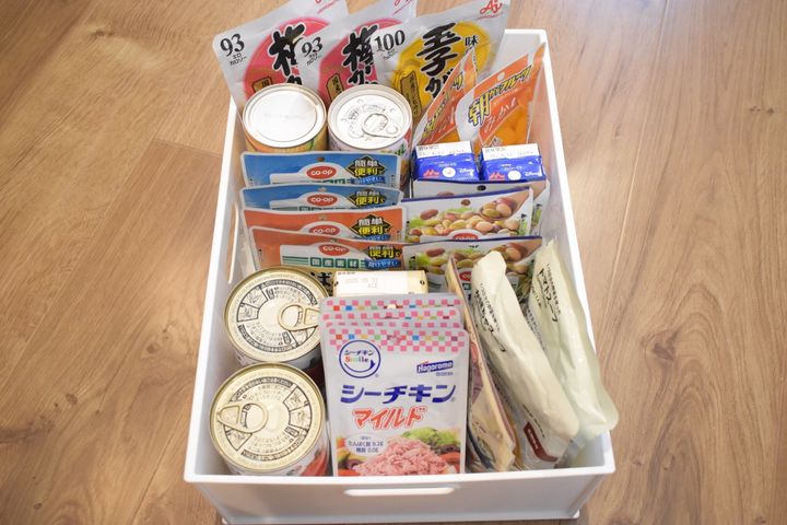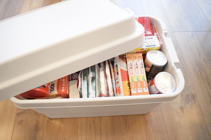 あまり取り出す機会がない長期保存の非常食や、そのほかの防災グッズは蓋付きボックスに収納するのをおすすめします。