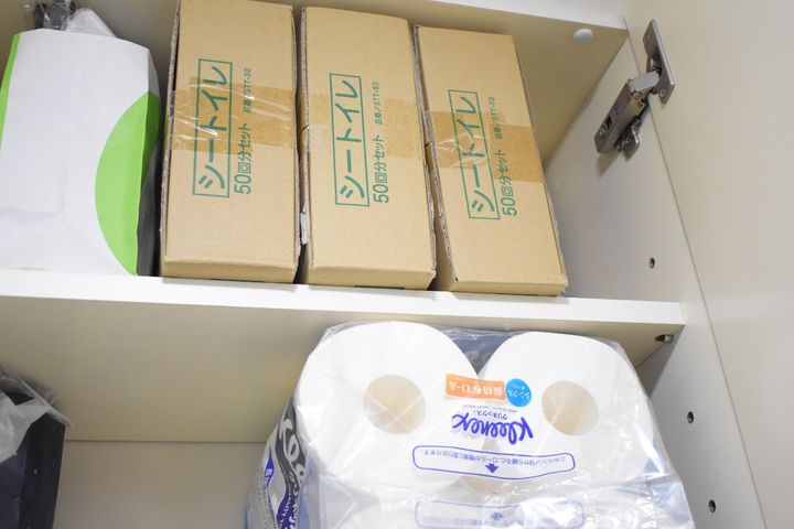 わが家では在宅避難中に自宅の便器を利用しながら非常用トイレを使用することを想定して、トイレ内の収納に非常用トイレ、処理用のポリ袋、消臭袋、消臭剤などをまとめて収納しています。非常時もトイレは待ったなしです。すぐに出して使えるようにしました。