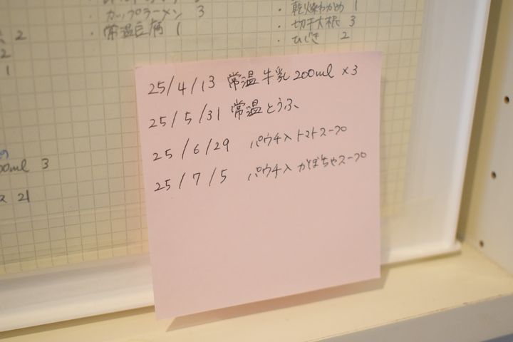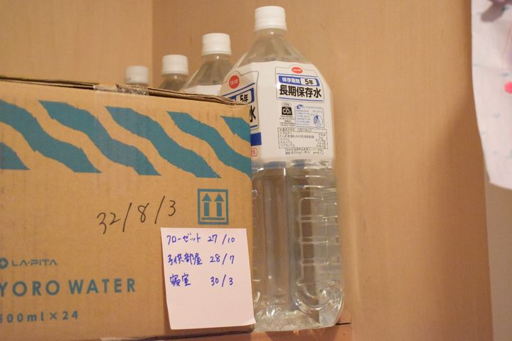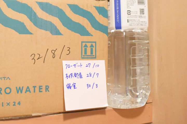 わが家では、防災グッズの保管庫に保管している水のケースに貼り付けて、すべての場所の水の賞味期限を一か所で確認できるようにしています。