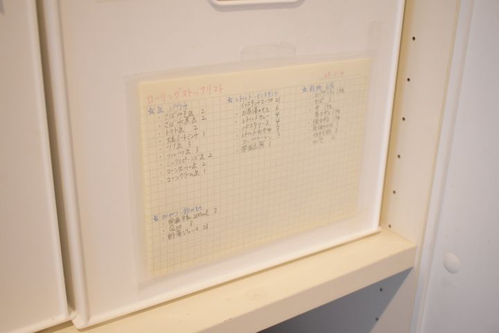 ローリングストックは「使ったら買い足す」というサイクルが滞るとうまく機能しません。不足はないか、滞留が起きていないかと常に確認しておく必要があります。そのため、一目で在庫状況を確認できるように収納し、ストックの近くにリストを貼り出しておくのが良いでしょう。
