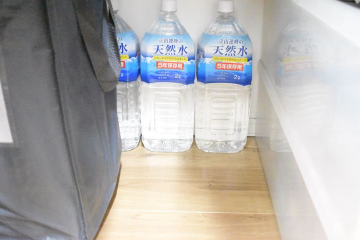 保存水は特にストック量が多くなりがちです。4人家族が1週間分を備蓄する場合、2Lペットボトルで42本分(1人1日3L×4人×7日=84L)もの量が必要です。一か所にまとめて保管できるスペースを確保するのはなかなか難しいですよね。