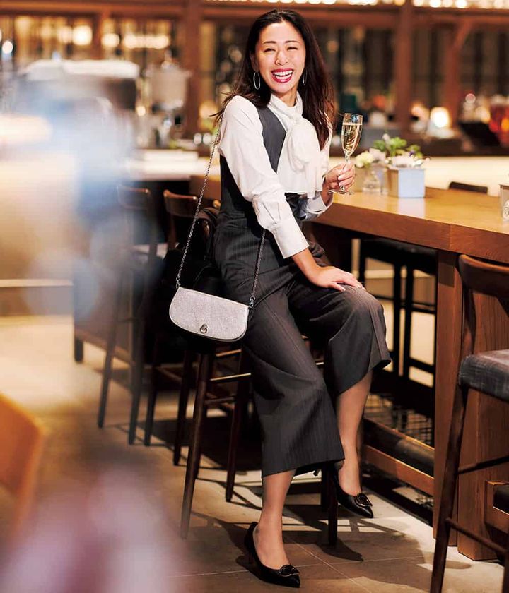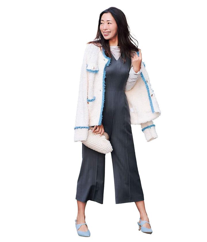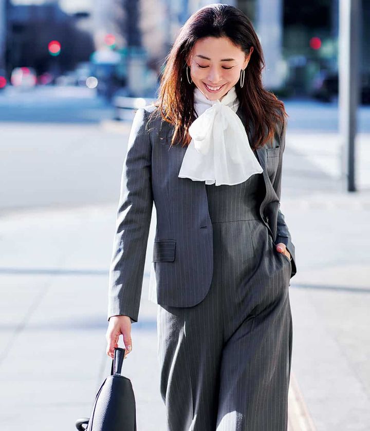 ジャケット¥154,000オールインワン¥143,000(ともにアキコ オガワ/エストネーション)ボウタイブラウス¥26,400(TOMORROWLAND collection/TOMORROWLAND)バッグ¥66,000(ヴァジック/ヴァジックジャパン)チェーンバッグ¥45,100(ジャンニ キアリーニ/ジャンニ キアリーニ 銀座店)パンプス¥18,150(ダイアナ/ダイアナ 銀座本店)ピアス¥42,900(マリハ)バングル¥80,520(バルブス/ZUTTOHOLIC)