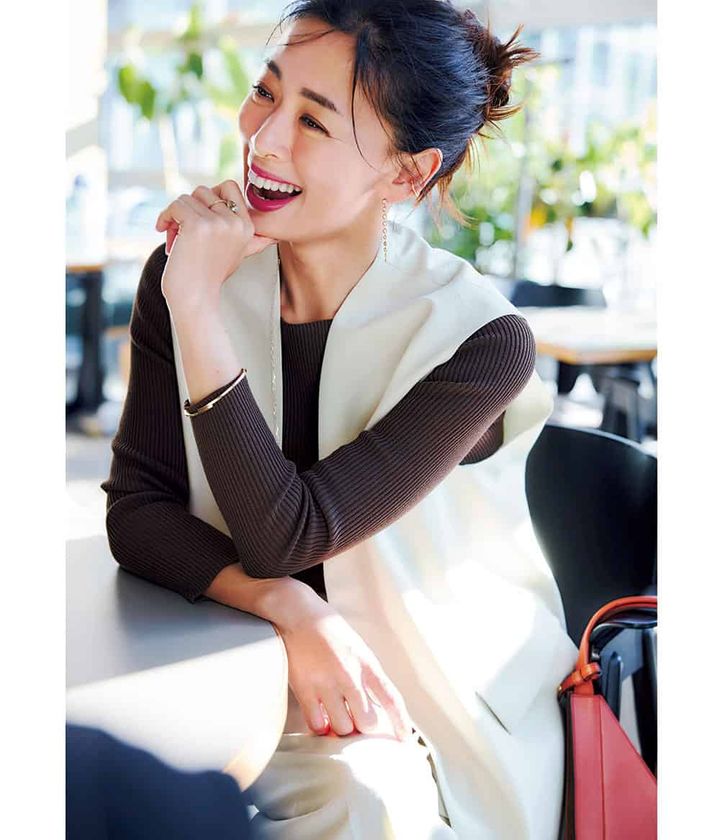 隠しボタンデザインのジレはよりスマートさを加速。さらにかっこいい印象に導きたいなら、インナーはニュアンスカラーよりも締まるダークカラーがおすすめ。さりげなくジュエリーを効かすのが大人の余裕。