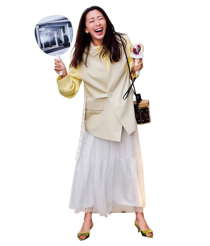 ジレ(着回し)¥60,500(デパリエ/デパリエ 伊勢丹新宿店)イエローニット¥26,400(アルアバイル/アルアバイル)ドットチュールスカート¥38,500(ティアラ)バッグ¥77,000(WAIWAI/TOMORROWLAND)サンダル¥69,300(ネブローニ)バングル¥48,180(ソコ/ZUTTOHOLIC)ピアス¥31,900ネックレス¥38,500(ともにマリハ)