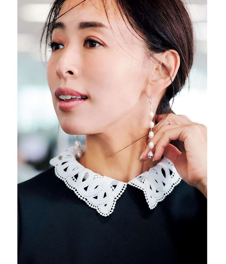 取り外し可能なレース衿はシーンや気分に合わせて印象を自由自在にチェンジ。ほんのり甘さ香るペプラムデザインもボトムスがハンサムなワイドシルエットなら程よく甘さがセーブされ40代のリアルに。