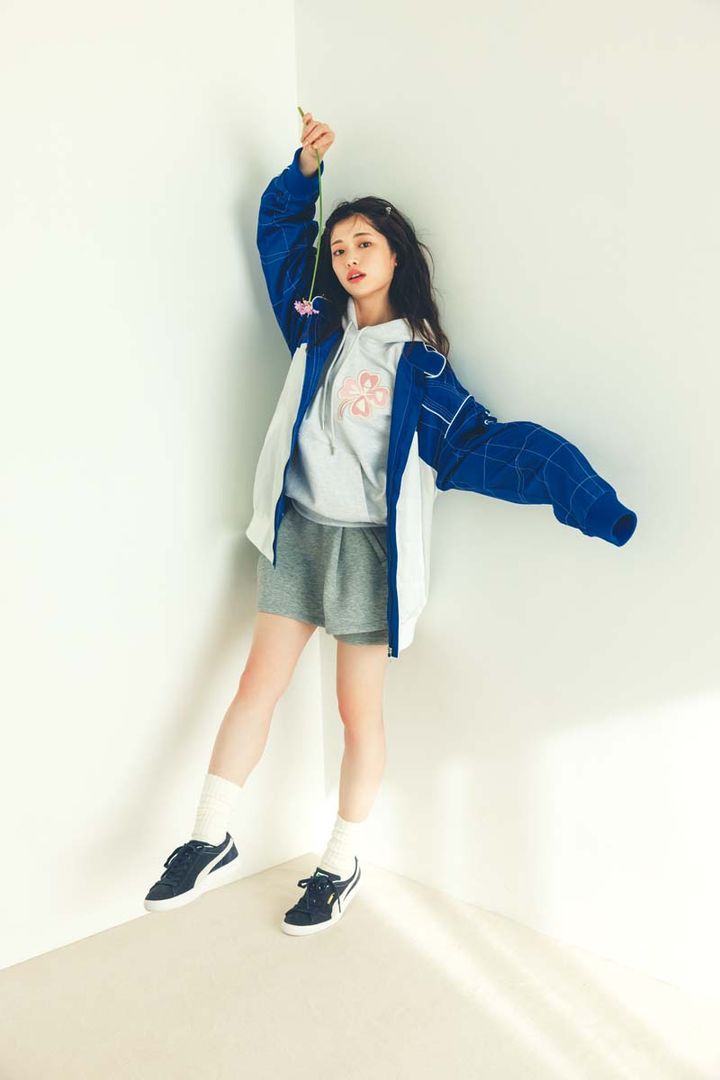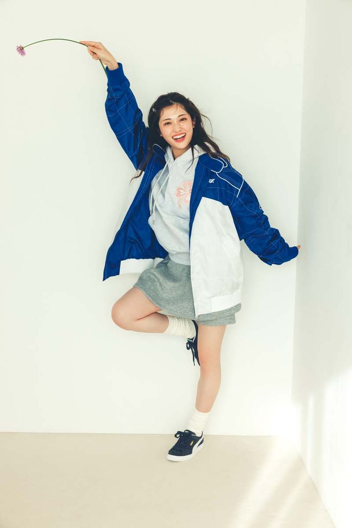 ブルゾン¥28,600、スニーカー¥12,100/ともにプーマ(プーマ お客様サービス)、パーカー¥15,400、スカパン¥19,800/ともにマルディメクルディ(マルディメクルディジャパン)、ヘアピン¥1,760/ゴールディ、ソックス/スタイリスト私物