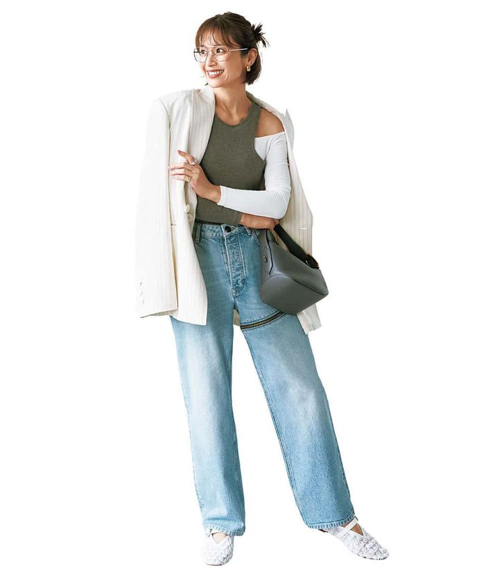 ジャケット肩がけでリッチな大人のデニムスタイルに。白とグレーの2枚重ね風デザインが印象的なボディスーツ。