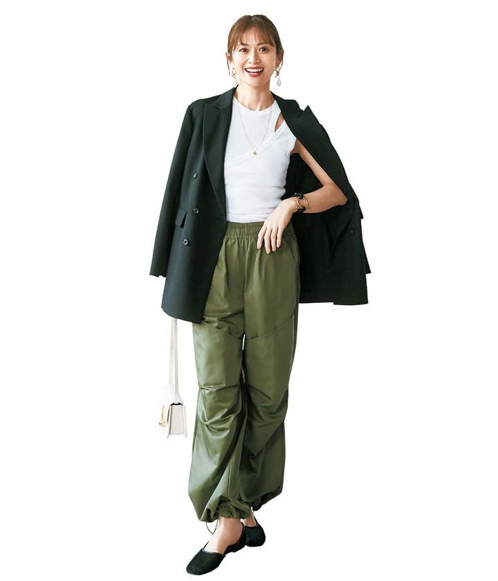 難易度が高そうな変形トップスは、端正なジャケットを羽織ればスッキリ簡単。肌見せも軽減できて大人のスポーティに仕上がります。
