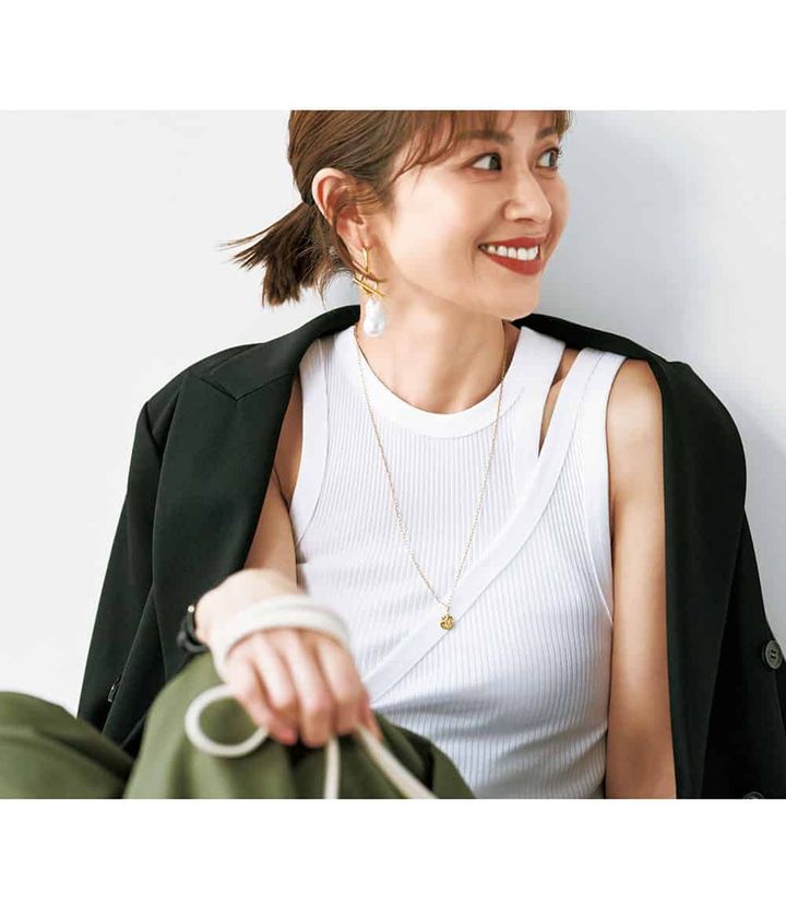 ジャケット¥79,200(ニアー ニッポン/ニアー)タンクトップ¥12,100(ハイク/ボウルズ)パンツ¥13,640(ナイキ/NIKE カスタマーサービス)バッグ¥69,300〈マエストソ〉バングル¥42,900〈シーエックスシー〉(ともにアマン)靴¥44,000ピアス¥16,500(ともにダブルスタンダードクロージング/フィルム)ネックレス¥24,200(マリハ)