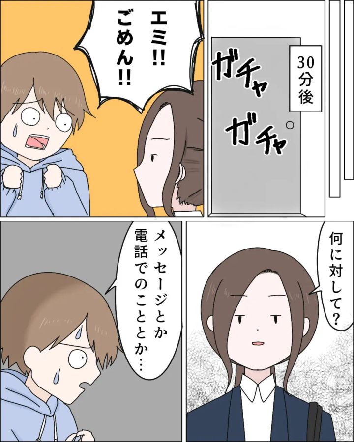 レイさんから「じゃ、ヒナんち泊まってもいい?」と謎のメールが届いたかと思えば、「ちがうってカオル・・」と元カノの名前で電話!「もう無理」とエミさんが電話を切ってから30分後のこと、ガチャガチャとドアを開ける音が。そして、