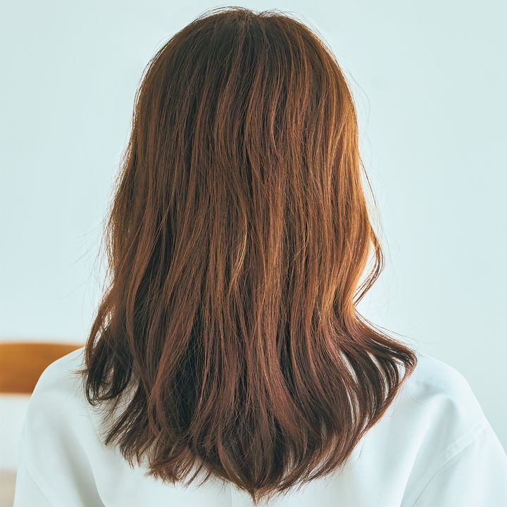 鎖骨下6cm、前髪は長めの唇の高さでカット。トップがふんわりするよう内側からレイヤーを軽く入れ、軽さを出すために毛先にはローレイヤーを。全体のヘアカラーは9レベルのブラウンに、ローライトの6レベルのベージュを細かく入れて立体感を演出しています。