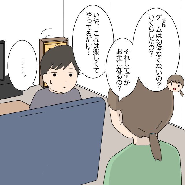 ゲームしているたかしさんを問い詰めたかなえさんは、「私に『お金にならない事をして勿体ない』って言ったのに、ゲームは勿体なくないの?いくらしたの?それして何かお金になるの?」たかしさんにたずねると、「いや、これは楽しくてやってるだけ・・」と言うたかしさん。
