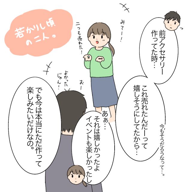 すると、「前アクセサリー作ってた時・・これ売れたんだーって思うようにしてたから・・今もそうだろうなって・・」たかしさんの言葉に、「あぁ・・それは嬉しかったよ。でも、今は本当にただ作って楽しみたいだけなの」かなえさんがそう言うと、