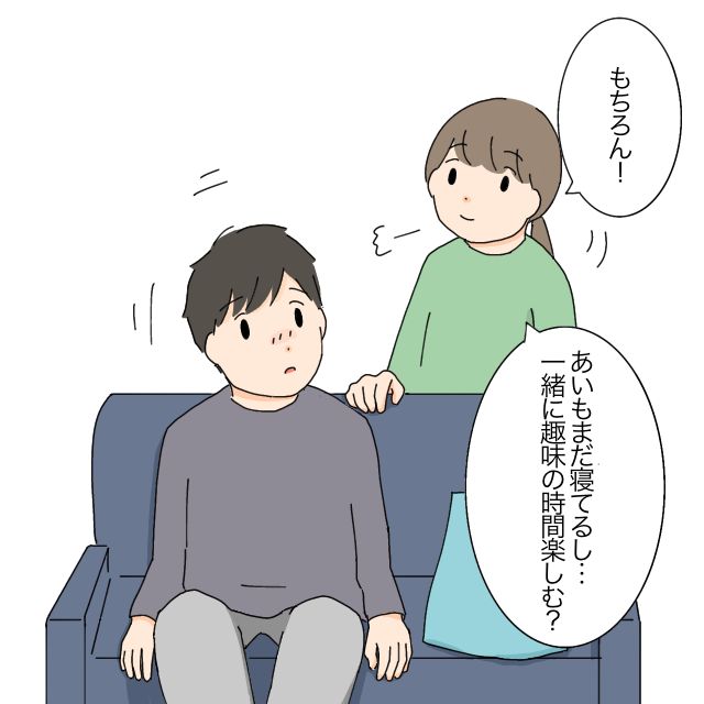 たかしさんの言葉に、「もちろん!めいもまだ寝てるし・・一緒に趣味の時間楽しむ?」かなえさんにそう言われて、驚きながら顔をあげるたかしさん。