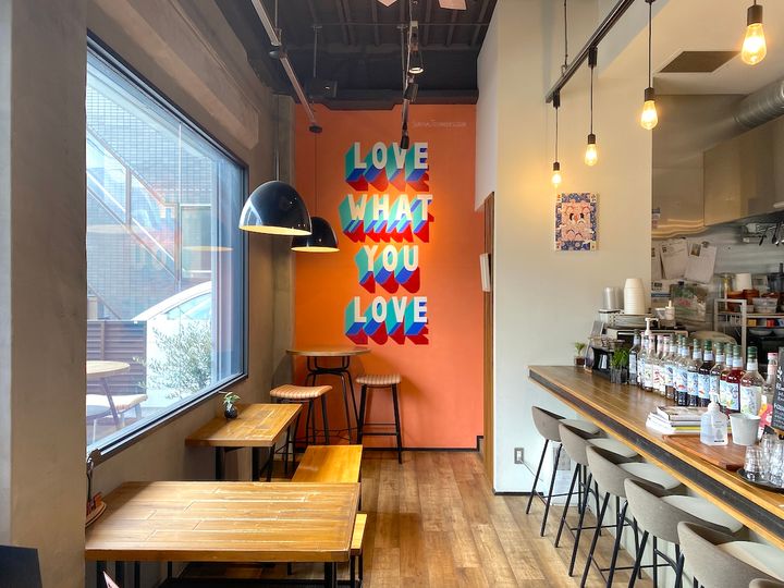 「BlissCAFE」の店内は暖色系の照明が飾られた落ち着きのある空間。イギリスの画家によるウォールアートでおしゃれな雰囲気も感じられます。座席はテーブル、カウンター、テラスに分かれており合計24席。晴れの日はテラス席で太陽にあたりながら優雅に過ごすのがおすすめです。