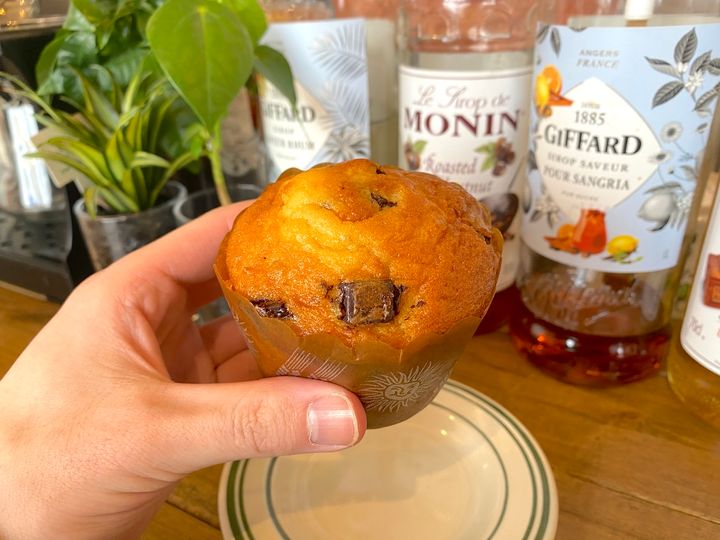 材料にこだわったことで、時間が経ってもふんわりとした食感を楽しめるのが「チョコマフィン」230円。甘みのある生地の中に、甘さ控えめのチョコチップを入れることでバランスとれた味わいに仕上がっています。食感の楽しさと絶妙な甘さで最後まで飽きずに食べられる1品です。