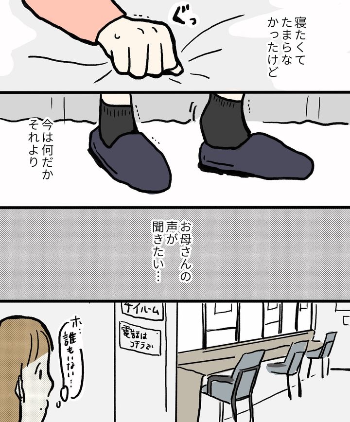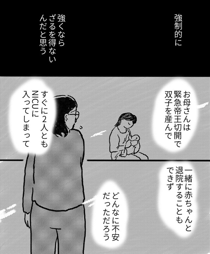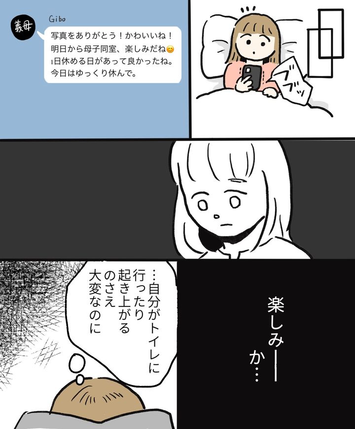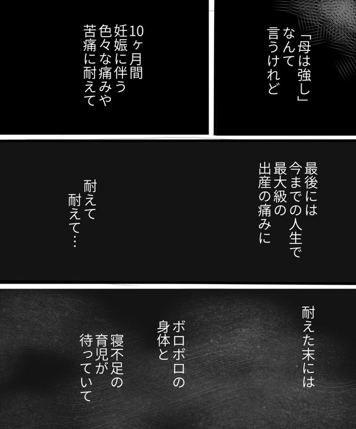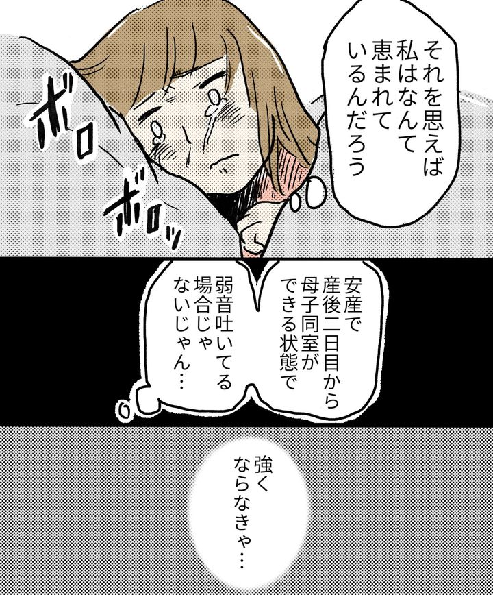 このあと、もちみかんさんは「自分の身体がしんどくても、子どもの顔を見に行かなければいけない」「子どもを見に行かなかったら周りからどう思われるんだろう」「母子同室を楽しみと思わなければいけない」「母親なんだから強くならなきゃいけない」など、どんどん自分を追い込んでしまいます。