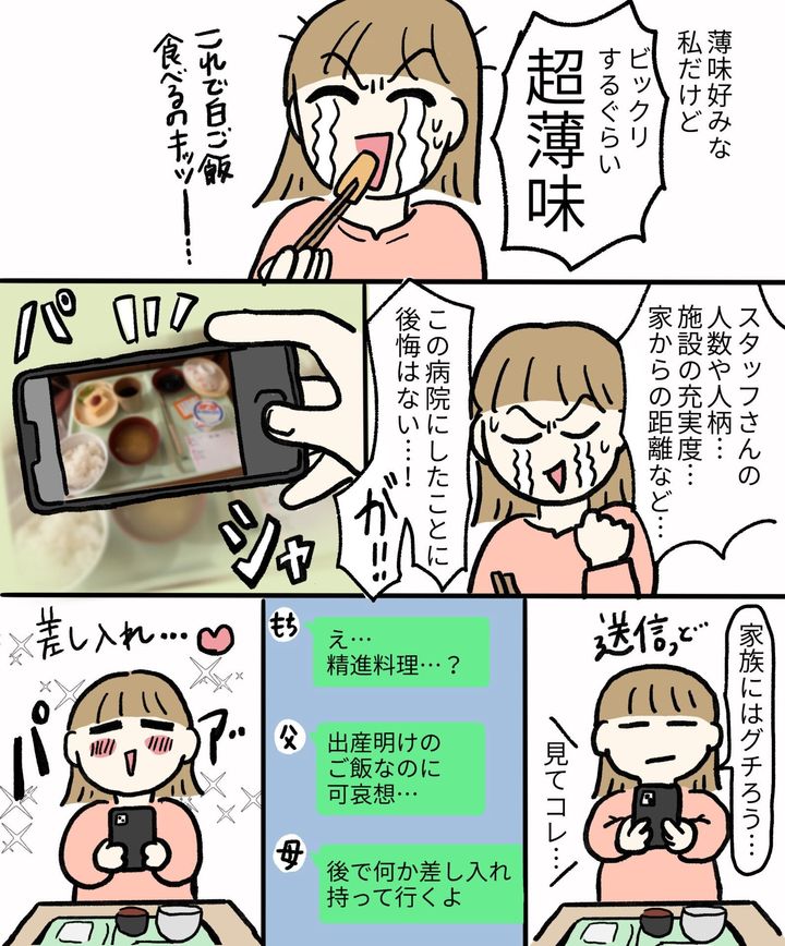 ─なるほど。新生児期の大変さって、実際に経験すると想像を絶しますよね。作中のあとがきで「入院中の楽しみって、本当にご飯ぐらいなんですよね…。」とありましたが、食事以外でも、もちみかんさんが出産〜入院を経験して「この病院にしてよかった」と思ったことはありましたか?