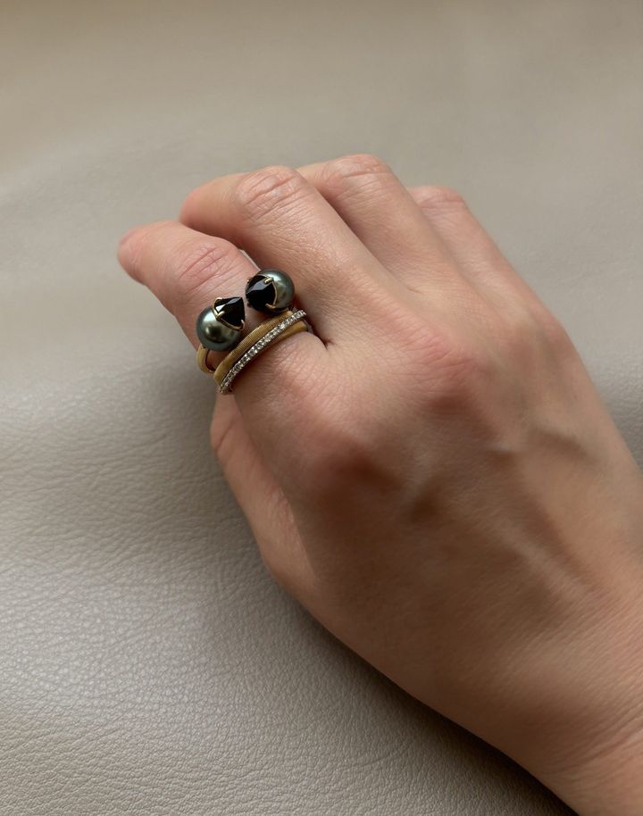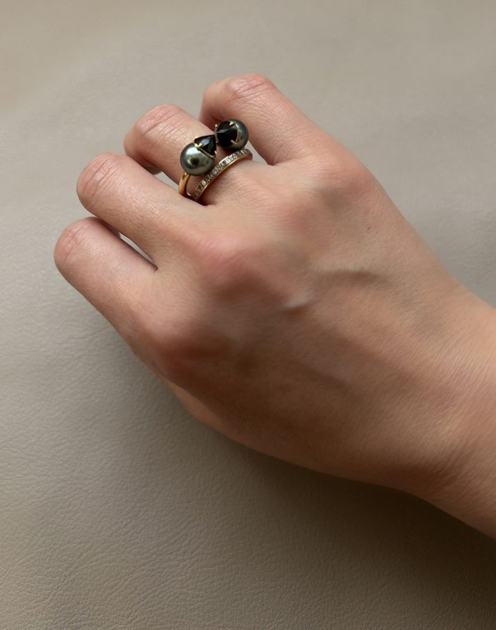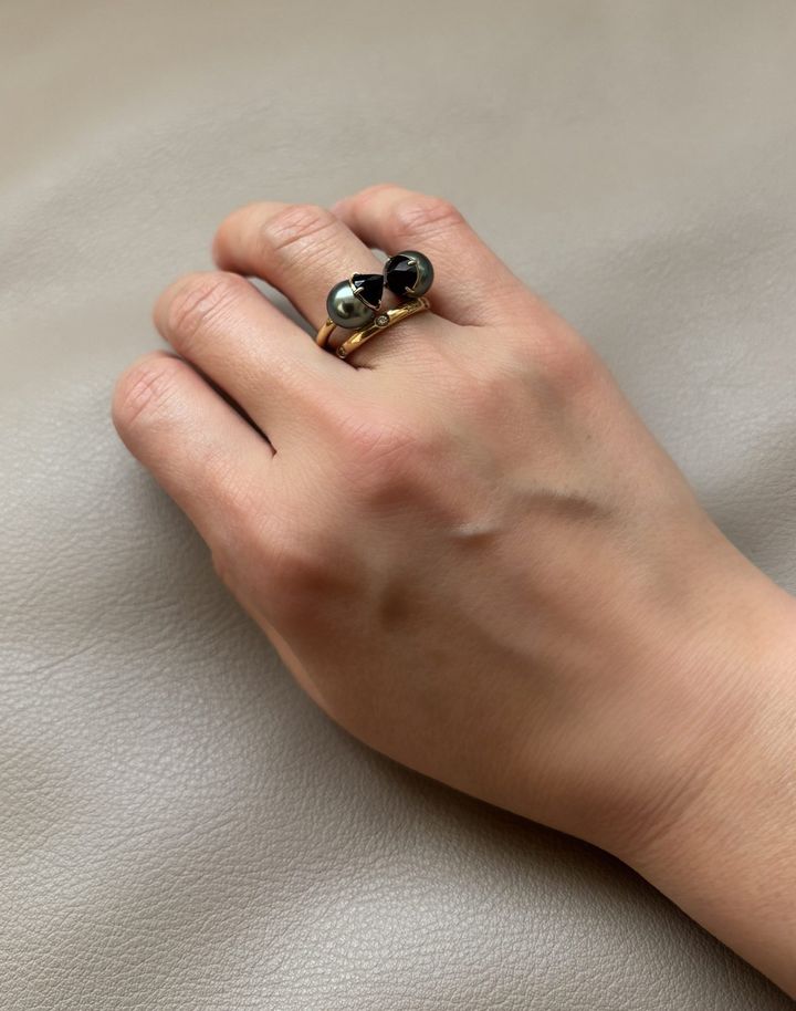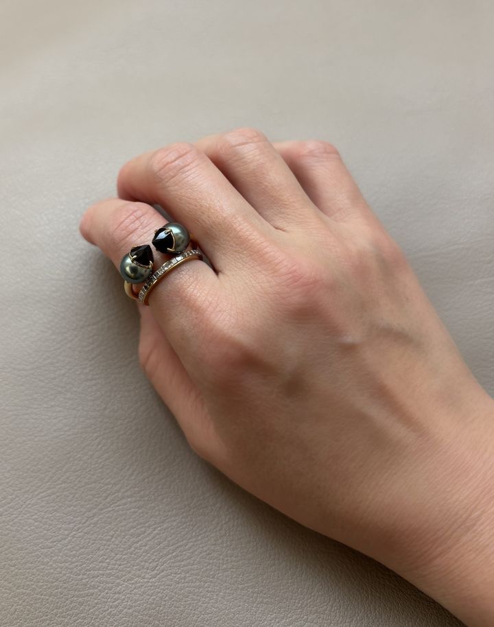 実は、発売当初から気になっていた「リファインド リベリオン シグネチャー」(イエローゴールド×南洋真珠 黒蝶×ブラックスピネル)リング。2009年からTASAKIのクリエイティブディレクターに就任したタクーン・パニクガル氏らしさが堪能できるデザイン。パールのカラーは個体差があるので、持っているタヒチアンパールのピアスに合わせて選びました。