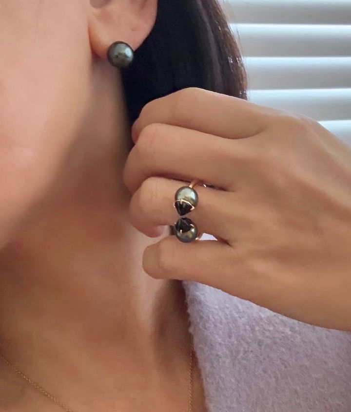 持っているのは、小粒のホワイト、大粒の黄味がかったもの、そしてタヒチアンパールの3種。あこやや白蝶系のリングは何個か持っているのですが、タヒチアンパール、黒蝶のリングは持っていなかった(アクセサリー風リングは除く)ため、コーディネートに毎朝悩むように。