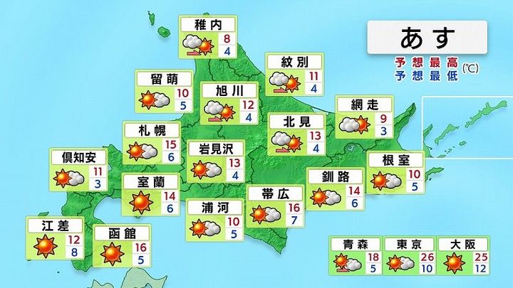天気が回復し、各地で晴れるでしょう。風もしだいに弱まります。日中の寒さは解消し、最高気温は札幌15度、帯広や函館は16度と暖かくなりそうです。