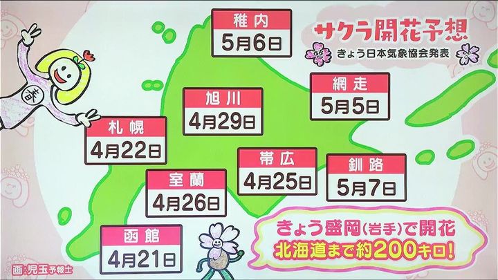 サクラの開花予想がきょう16日(水)、日本気象協会から発表されました。前回の予想より1日~2日早くなりました。函館は来週月曜の4月21日、札幌は4月22日で4月中に見ごろを迎えそうです。きょうは盛岡で開花し、桜前線は北海道までおよそ200キロまで迫っています。
