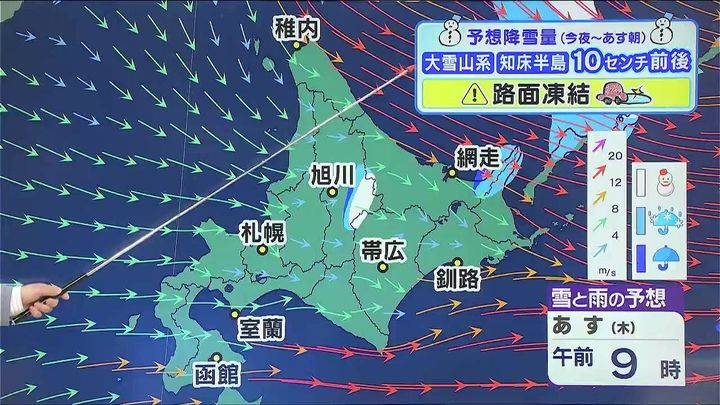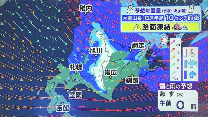 ただ、今夜からあす朝までに山沿いの多いところで10センチ前後の雪が降り、上川地方では平地でもうっすら白くなるおそれがあります。路面凍結に注意して下さい。