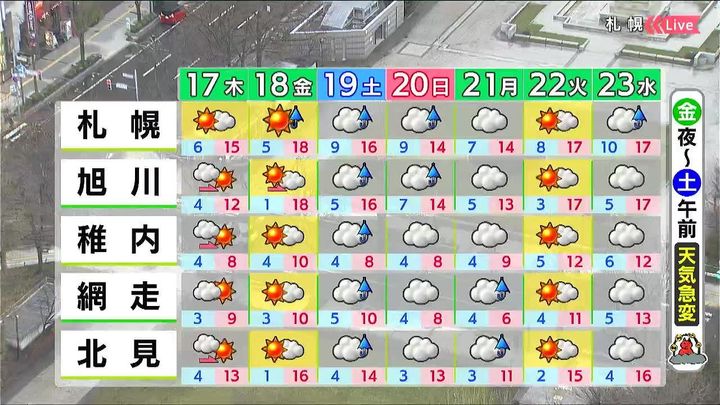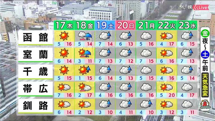 金曜も晴れて、札幌や旭川は18度まで気温が上がります。その後も気温は高めですが、天気は変わりやすく、金曜夜から土曜の午前中は急な強い雨に注意が必要です。