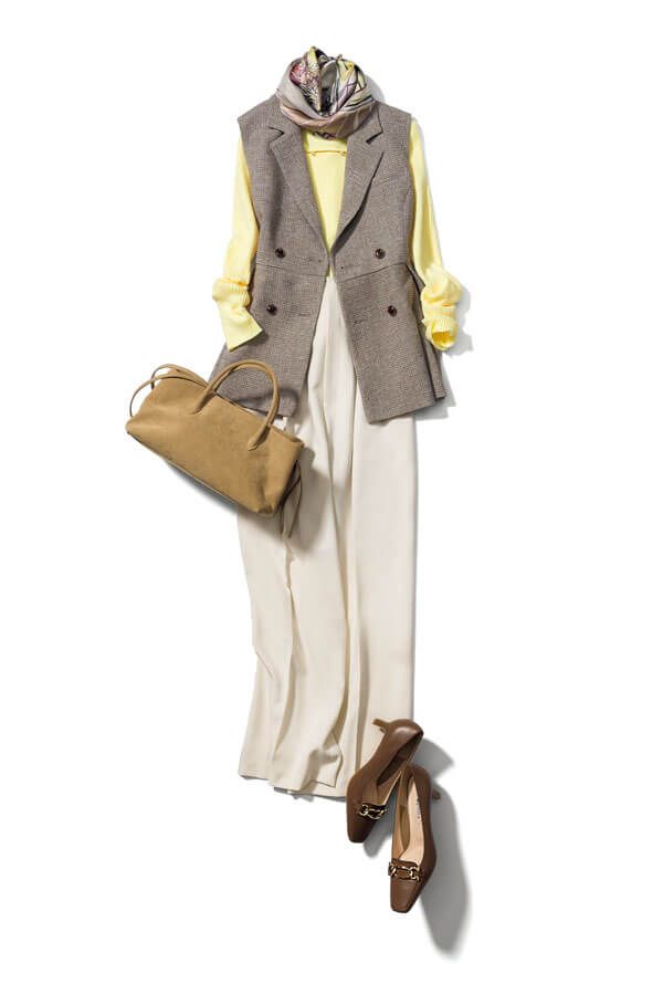 パンツ/着回し(下記詳細) ジレ¥16,940/LILY BROWN ニット¥6,600/RESEXXY スカーフ¥14,300/銀座かねまつ(銀座かねまつ6丁目本店) バッグ¥46,200/メアリ オルターナ(AL Design Inc.) 靴¥18,150/ダイアナ(ダイアナ 銀座本店)
