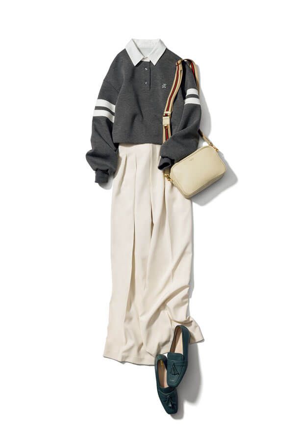 カジュアルなスウェットも襟付きならきれいめに着られるので、フェミニン派こそ取り入れてみて。シックなグレーも上品で、クリーンなパンツと好相性です。
